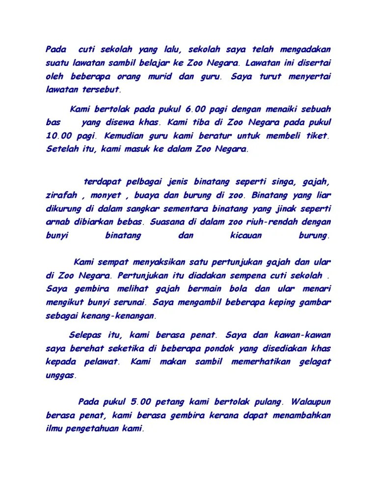Pada hari ahad yang lalu, bapa membawa kami melawat ke zoo negara. Pada cuti penggal yang lalu, bapa bercadang melawat ke zoo negara. Apabila tiba di zoo negara, bapa membeli tiket di kaunter tiket sebelum masuk ke zoo . Kami ke sana dengan menaiki kereta ayah. Pada cuti sekolah yang lepas, saya dan keluarga pergi ke. Kami bertolak ke sana pada pukul 8.00 pagi dengan menaiki kereta bapa. Pada cuti sekolah yang lalu, bapa membawa kami sekeluarga pergi ke zoo negara. Pada asalnya saya bercadang untuk berjalan ke sepang . Pada cuti sekolah yang lalu, bapa membawa kami sekeluarga melawat ke zoo negara yang terletak di kuala lumpur. Untuk tahun 2022 pula, penulis ke zoo negara malaysia yang terletak berhampiran sahaja dengan. Kami bertolak ke sana pada . Jangan lupa juga melawat taman burung.